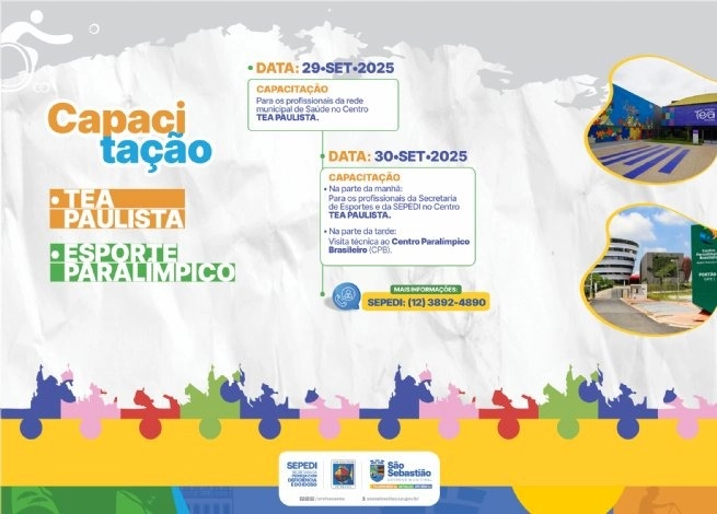Nos dias 29 e 30 de setembro, a Prefeitura de São Sebastião realiza a capacitação “Transtorno do Espectro Autista (TEA)” para mais de 500 profissionais das Secretarias de Saúde (Sesau), Esportes (Seesp), Pessoa com Deficiência e Idoso (Sepedi) e Desenvolvimento Social (Sedes).