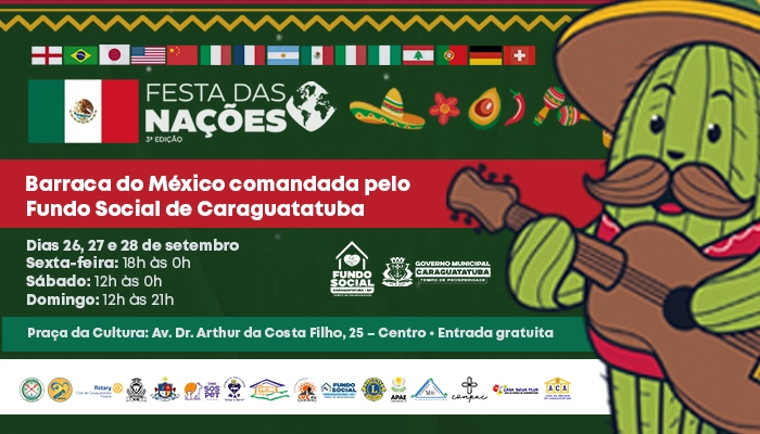 O Fundo Social de Caraguatatuba será responsável pela barraca do México, oferecendo pratos como burritos, chili e nachos, além de sobremesas como bolo de chocolate com pimenta. Para completar, drinques preparados com tequila e margarita, fruto de doações recebidas pela instituição.