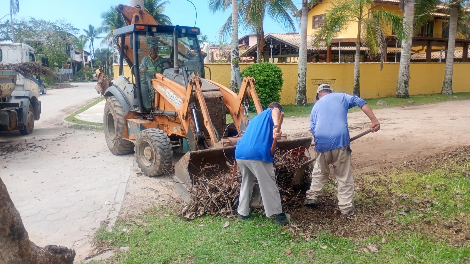 Ao final dos trabalhos manuais, máquinas pesadas como caminhões, retroescavadeiras, pás-carregadeiras e minicarregadeiras recolhem o material resultante das ações.